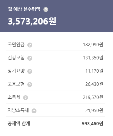 월급에서 국민연금, 건강보험, 장기요양, 고용보험, 소득세, 지방소득세 등 공제금액을 빼고 실제 통장으로 들어오는 돈인것이죠. 부양가족이나 기타등등 개인마다 조건이 상이하기 때문에 어느정도 위의 실수령액과 차이는 발생할수 있습니다. 참고만 하시면 되겠지요