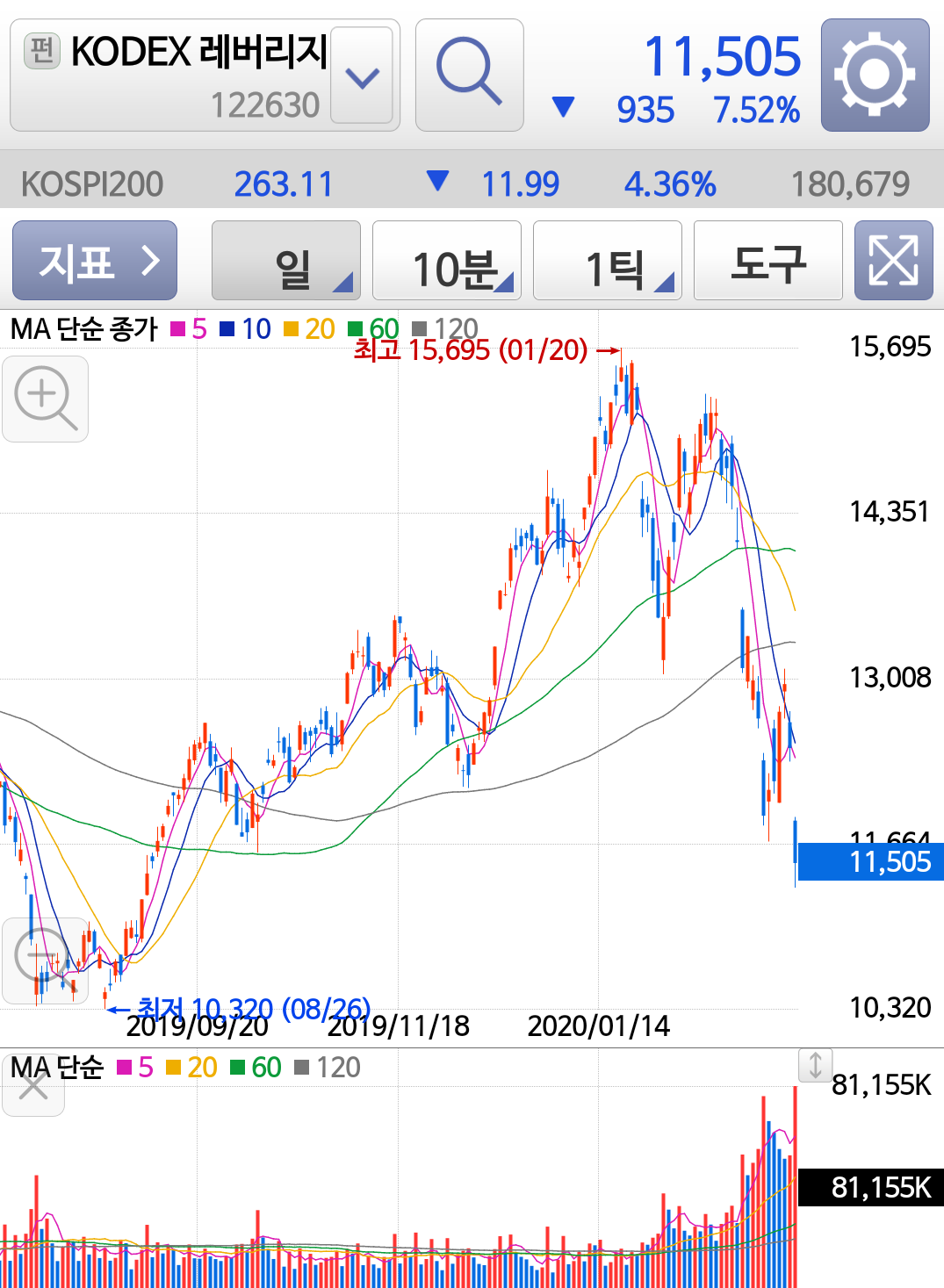 레버리지라는 이름에 맞게 하락도 시원하게 빠져준다. 그만큼 계좌도 많이 까짐...