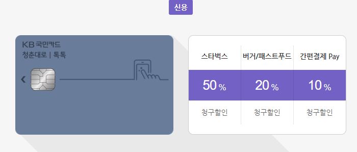 청춘대로 톡톡카드입니다. 스타벅스, 패스트 푸드점, 간편결제 Pay에 특화된 카드입니다.
