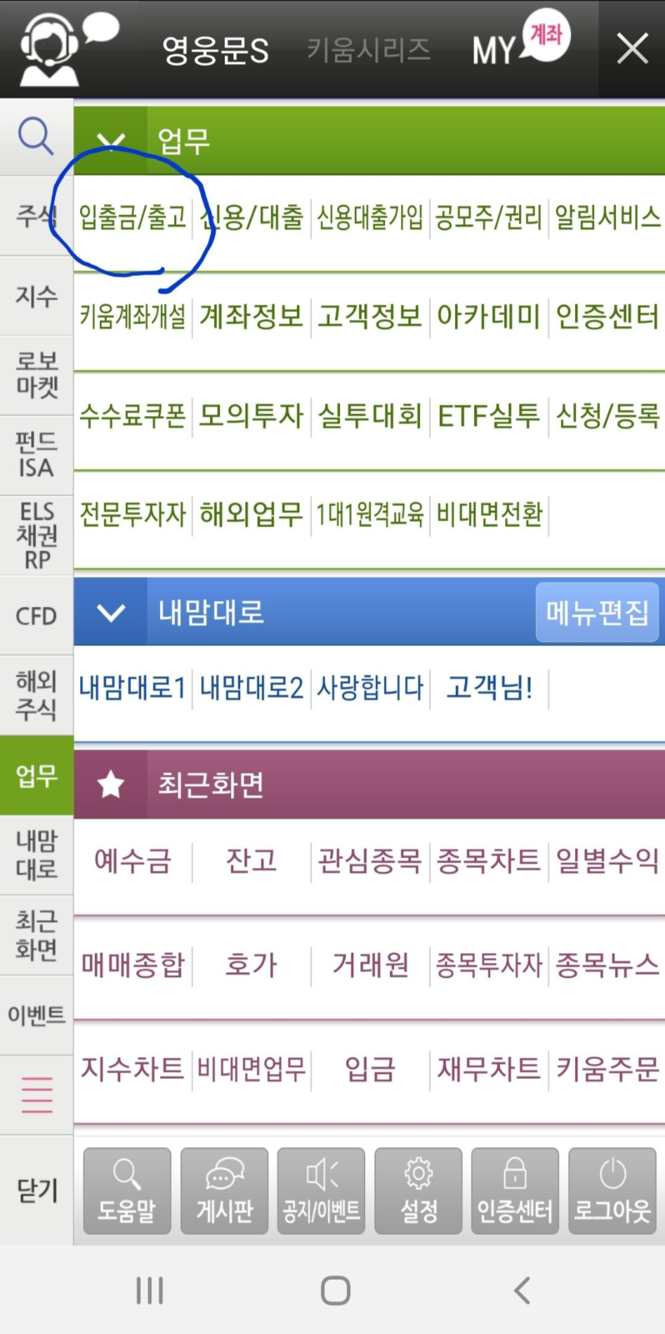 키움증권 메뉴 -> 업무 탭에서 입출금/출고를 터치합니다. 말그대로 입금와 출금을 할수 있는 메뉴입니다.