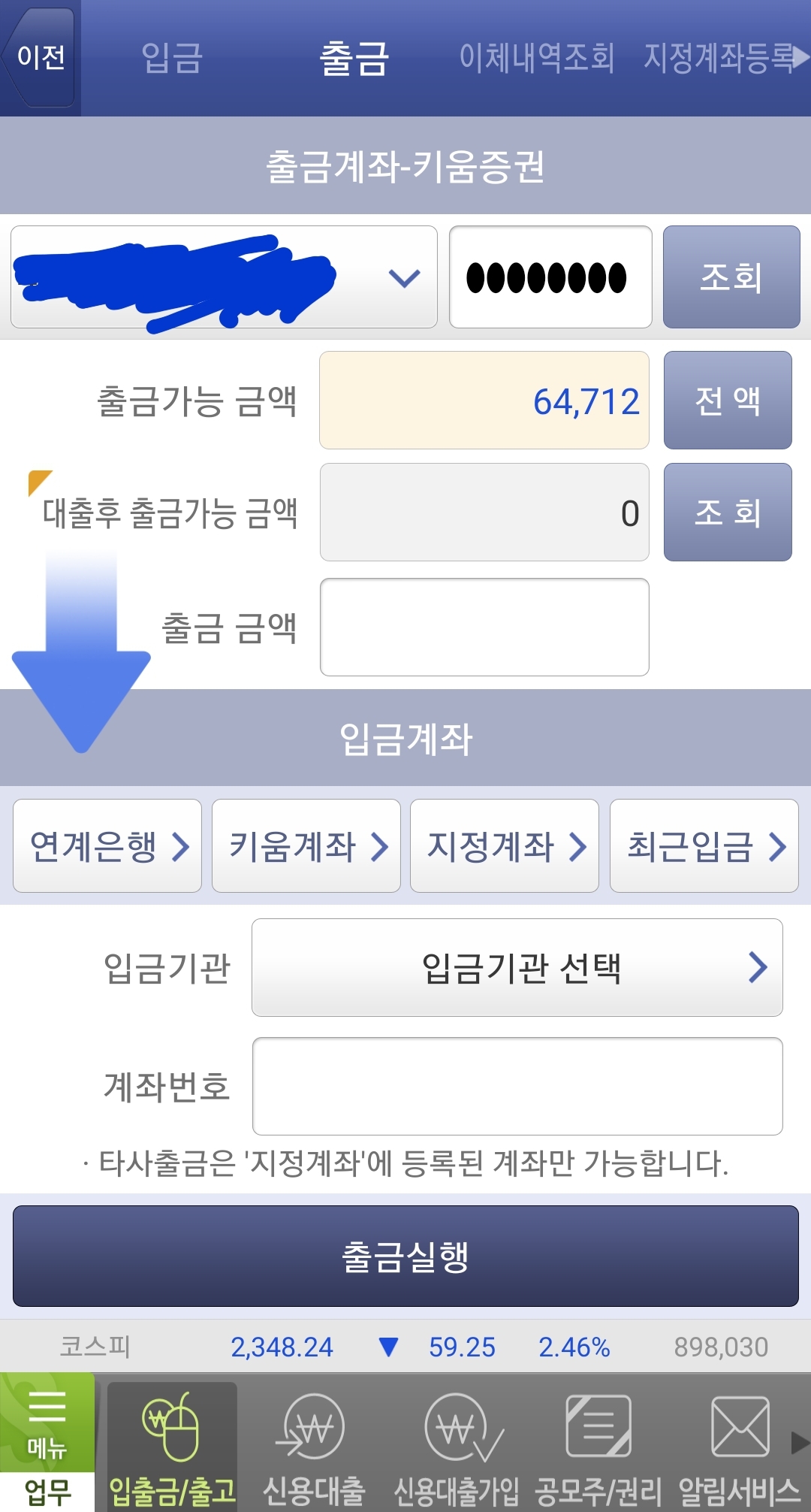 출금하는 법을 알아야 하기때문에 상위메뉴에서 출금을 선택합니다. 출금가능 금액이 64,712원이군요. 나머지 금액은 다 주식을 사놔서... 오늘 장이 안좋아서 맘이 아프네요..